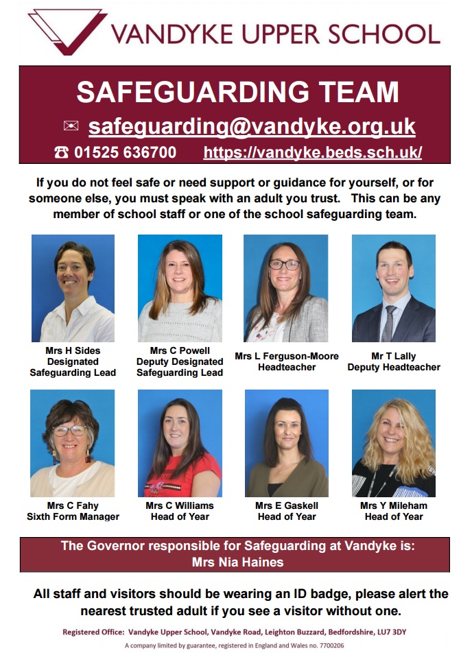If you have any safeguarding concerns about a young person at Vandyke, please contact Mrs H Sides (Designated Safeguarding Lead), or Mrs C Powell (Deputy Designated Safeguarding Lead), on the main school telephone number (01525 636700) or via email: [email protected]. You will find information about the school’s safeguarding team on this poster and can read our full Safeguarding & Child Protection Policy here.